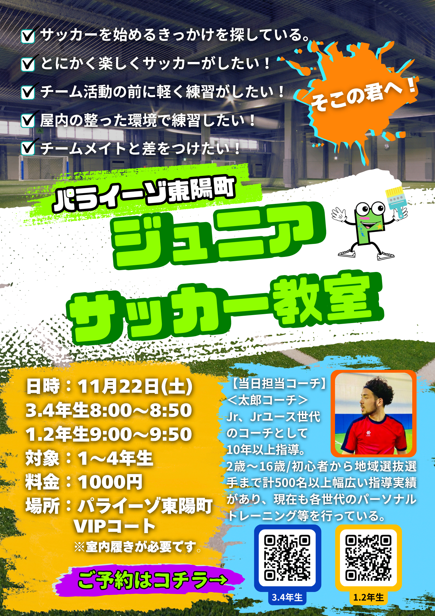 小学1~4年生対象に行うサッカー教室です。サッカーが初めての子もチームに所属している子も大歓迎です!経験豊富なコーチのもと、サッカーを全力で楽しもう!!