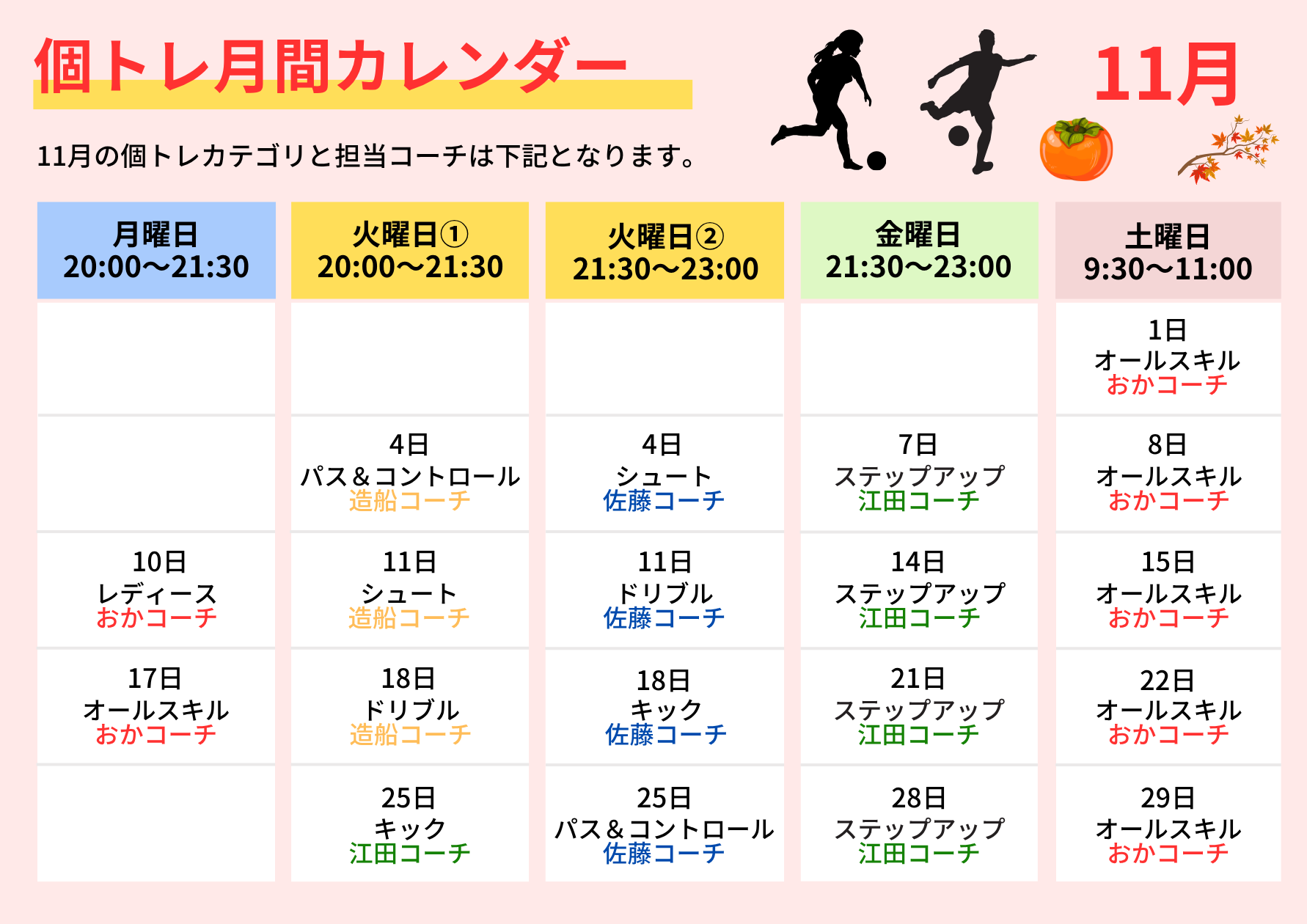 11月の個トレは以下のスケジュールで各コーチが担当致します。個トレの予約はコチラから👇